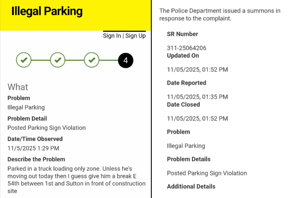 The NYPD did not give him a break. Seventeen minutes later, the 311 app reported that the Bronco had been given a summons for illegal parking.