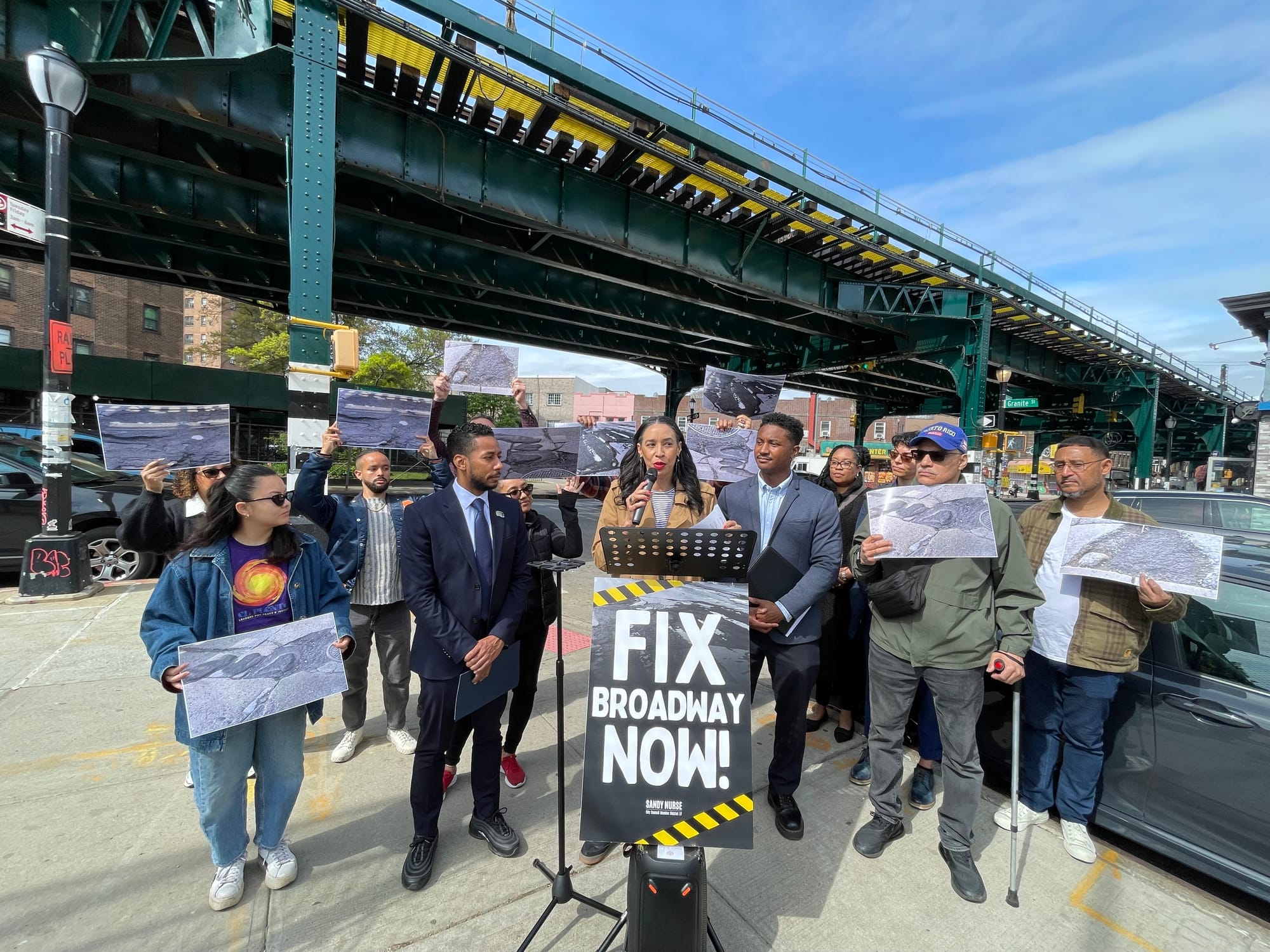 "With an administration that is embracing pothole politics, and just did a pothole blitz, we wanna see a blitz on Broadway," Nurse said, to cheers from community members. "So we just have one simple ask: We want DOT to fix Broadway. Now."