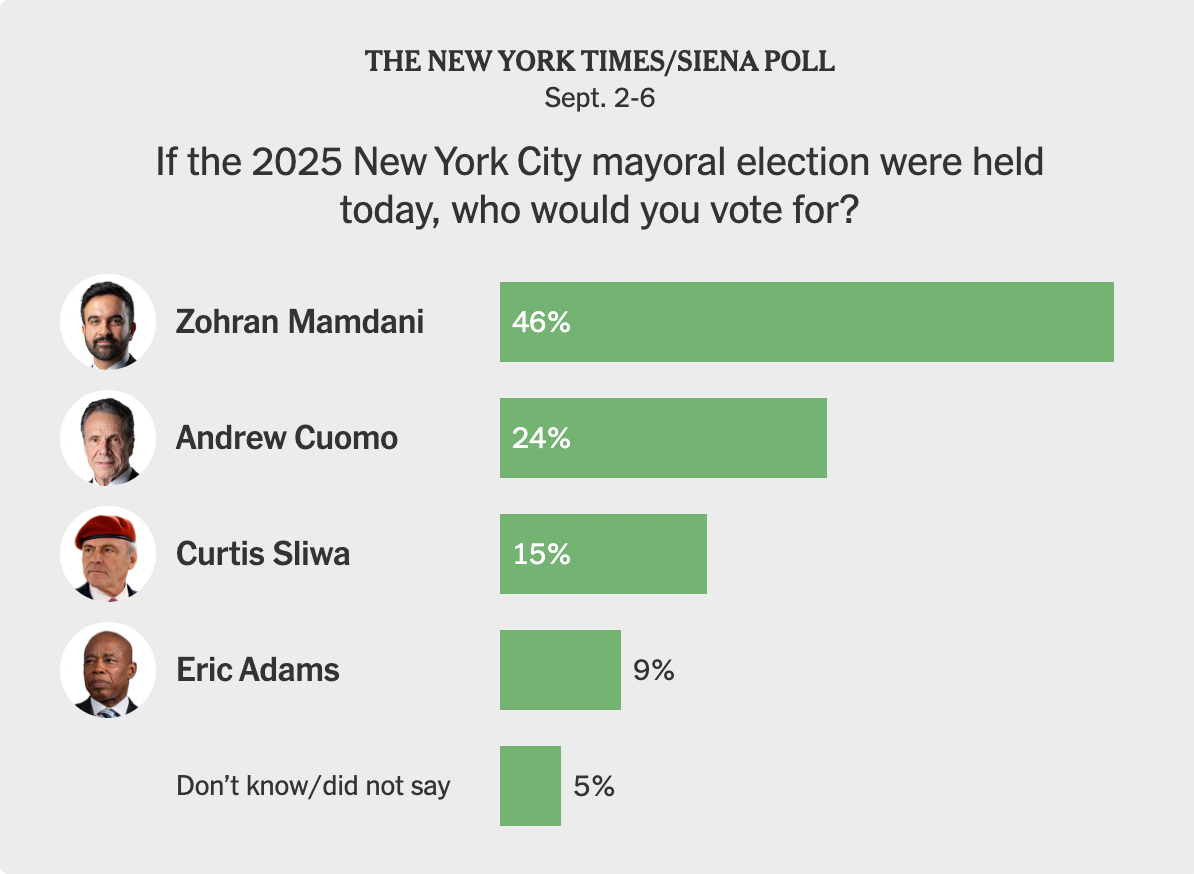 Since we last hit your inbox in July, Zohran Mamdani has remained the commanding favorite in the mayor's race. Today, a new NYT/Siena poll confirmed it—Mamdani is way ahead of the rest of the field, holding a 22 percent lead over former governor Andrew Cuomo, who's only nine percentage points ahead of Republican Curtis Sliwa. Trailing behind them all is current New York City mayor Eric Adams, who simply refuses to take the hint and drop out of the race (yet).