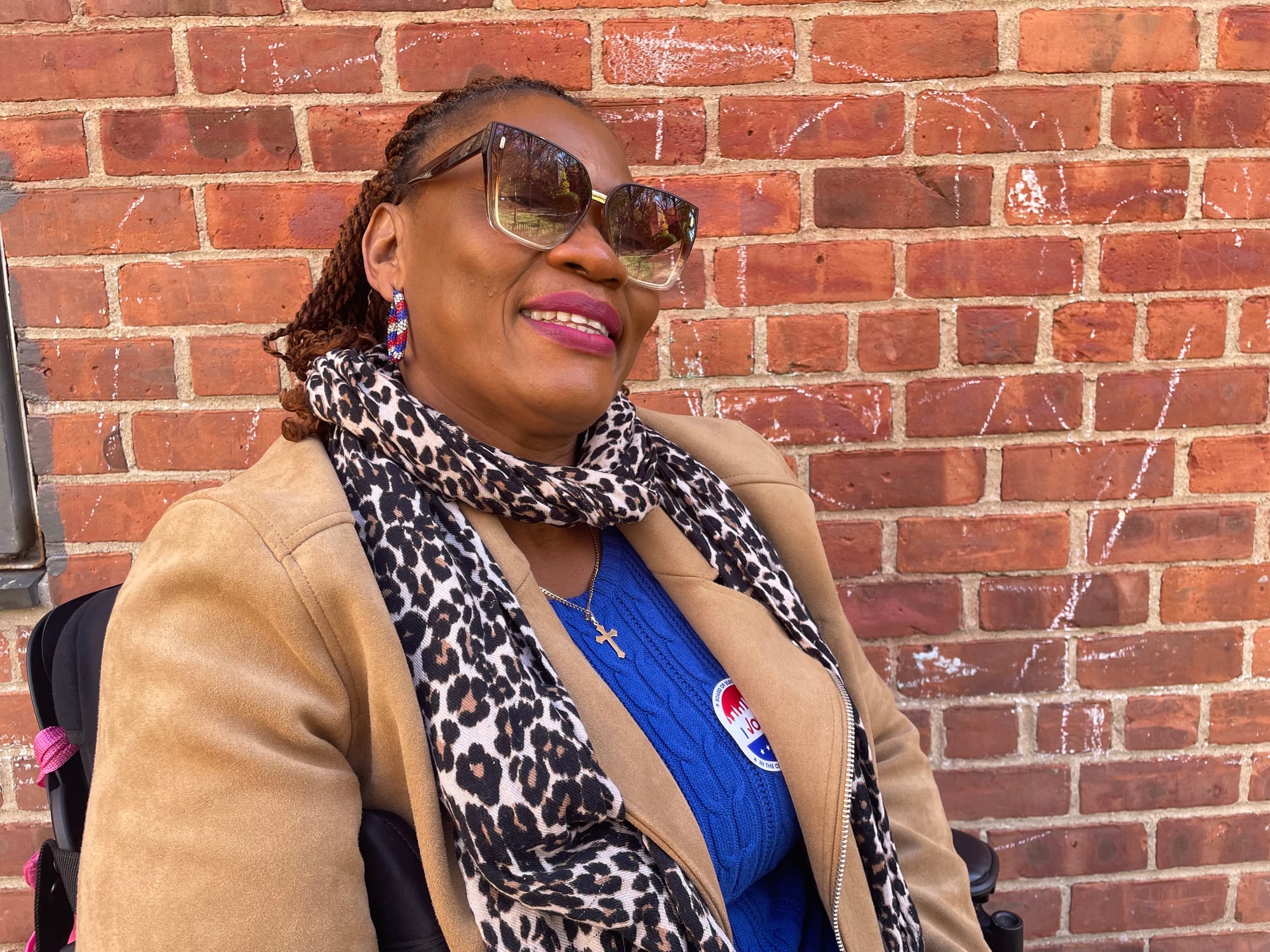 Finally, I spoke with Fati Vuillemey, who is originally from Niger but who has lived on Staten Island for 25 years. Vuillemey, who uses a wheelchair, was glammed up for the occasion, wearing lipstick and red-white-and-blue diamante hoop earrings. "Today is like my number one holiday, because election days are where all the decisions get made," she said.