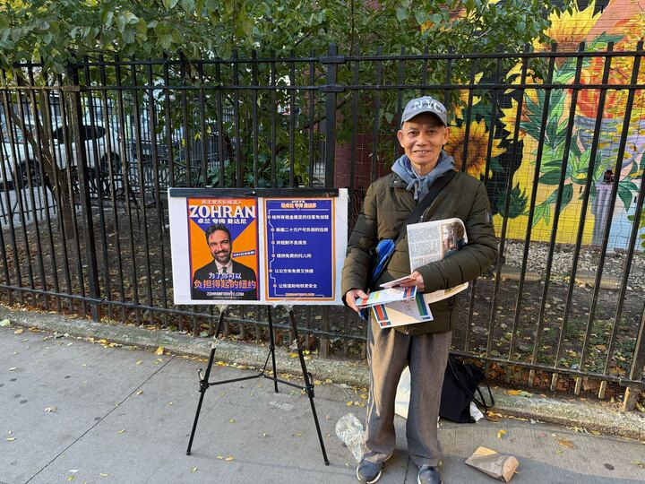 Down the block of MS 131 in Chinatown, Hong Yang, a member-leader at CAAAV Action, handed out palm cards for Zohran, in front of a sign written in Chinese listing the candidate's campaign pledges. CAAAV Action endorsed Mamdani on day one of his campaign, and is part of a coalition that's promised to push for the enactment of his agenda if he's elected. In part because of their efforts, Mamdani handily won Chinatown during the primary.