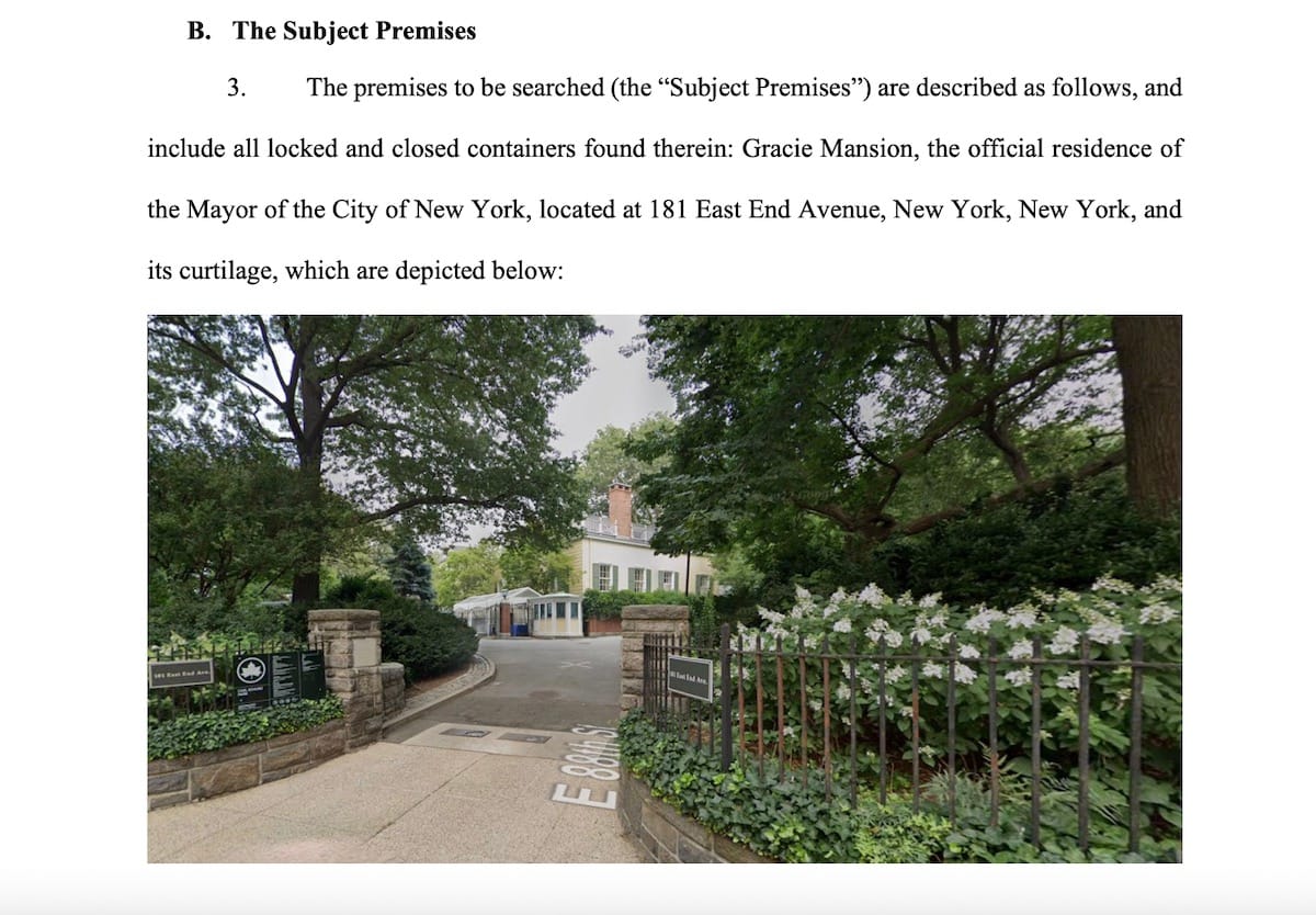 According to a trove of documents dumped on Friday afternoon by Trump's Department of Justice, when federal prosecutors asked to search Gracie Mansion in September of 2024, they noted that according to Adams's cell phone location data, the mayor "regularly spends the overnight hours of Monday, Tuesday, and Wednesday at [Gracie Mansion], and occasionally does so on other days as well."