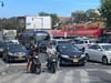 A bus is stuck in traffic on Fordham Road on a Sunday, when bus lane restrictions are not in effect (Hell Gate)