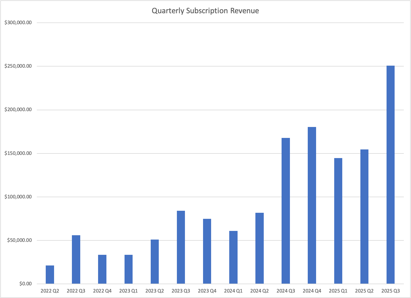 As of the end of September, we have more than 9,000 paid subscribers, a 69 percent increase from the previous annual report. At the end of September 2024, our monthly recurring revenue was around $42,000 a month. As this report goes live, it's nearly $70,000 a month, a 66 percent increase in one year. If recent growth trends continue, we'll hit a million dollars in annual subscription revenue some time in the first half of 2026.