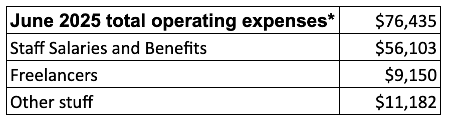 We gave ourselves much-needed raises at the beginning of 2025, after another year of dramatic growth made it clear that Hell Gate was on its way to being a going concern. Our reporters make $75,000 a year now, while our two editors make $85,000. That's more than a lot of people make, and it's also less than we'd like to be making in the inhumanely expensive metropolis where we reside. In April, we also brought on another staff writer and a part-time marketing and external relations manager, which meant that our spending on salaries, our single biggest expense, went up considerably, to nearly $52,000 a month.