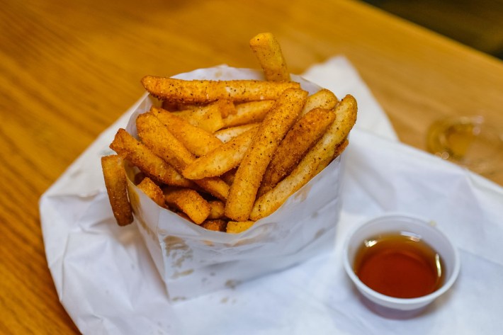 Major plot twist, every order of fries is served with a little crock of maple syrup for dipping, a condiment I don't think I've ever seen handed over in this context without explanation. "It's a little bit inspired by Karachi ketchup," Qafi said. "These kids sell this ketchup that no New Yorker would ever call ketchup. It is sweet and it is bright red. But also, my wife [Lutfeali] always likes to mix sweet with savory, so she thinks it's good." And she's correct. It rules.