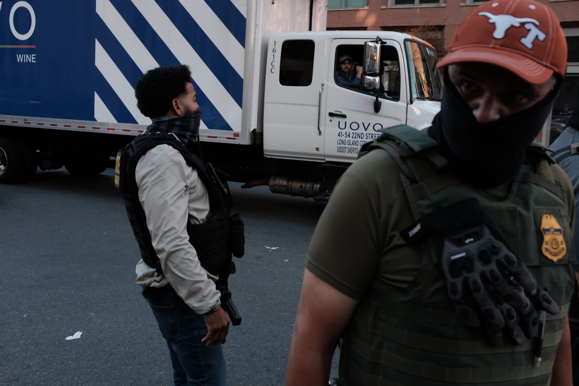 One agent present appeared to be the ICE agent who was briefly relieved of duties last month after he was filmed aggressively pushing a woman down at the 26 Federal Plaza immigration court in a viral video, though Hell Gate could not confirm his identity. According to reporting in CBS News, that agent, who remains publicly unnamed, was quickly reinstated after a brief preliminary review of the incident, in which he tackled the distraught wife of a man agents had just detained. At the downtown raid, he was one of the few agents without a face covering.