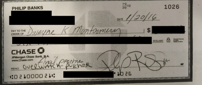 Except here is a check, found in a cache of public documents relating to the sale, that Banks wrote to Montgomery in early 2016, with "final payment overwatch purchase" written in the memo.