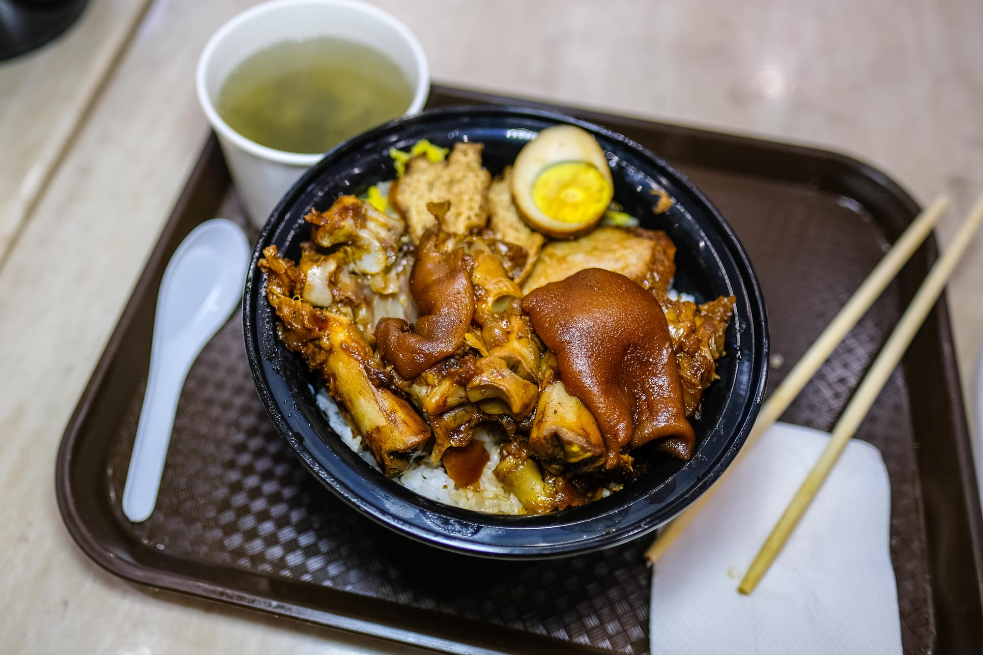 As the name suggests, both Pork Feet Rice locations specialize in exactly that: platters of hacked-up pig feet—dark, sticky, and slightly sweet with soy-based marinade—piled atop a mound of rice. Sometimes feet can be annoying to eat, with too much gnawing and too little to show for your efforts. But fortunately, that's not the case here.