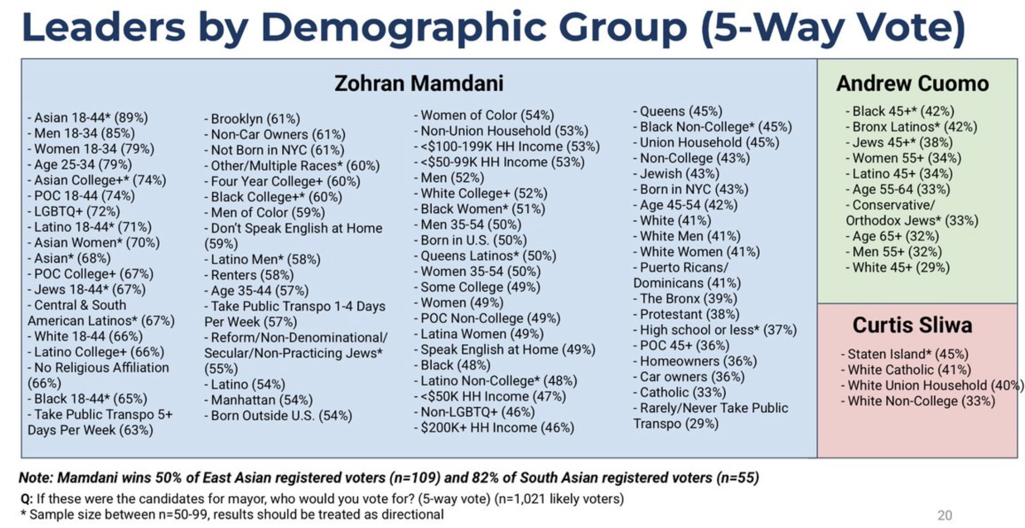 Mamdani's romp is laid out in a comprehensive new poll released Tuesday afternoon by Public Progress Solutions and Adam Carlson's Zenith Research. The poll is notable both for its large sample size—1,453 registered voters, 1,021 of them "likely voters"—and because it was conducted in four languages: English, Spanish, Chinese and Bangla.
