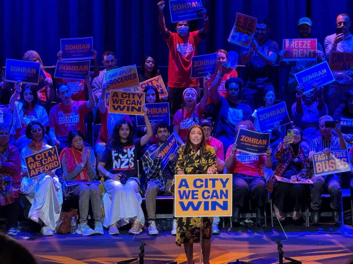 On the night of the first day of early voting on Saturday, Zohran Mamdani and 3,000 of his campaign volunteers crammed into Terminal 5 (we know, yuck), to show off the somewhat shocking political formation that he's assembled. There was John Samuelson, the head of the Transit Workers Union and a longtime nemesis of the DSA, calling Mamdani a friend of his and a friend of the transit union (they're big fans of his free buses plan, which led to less assaults on bus drivers). There was State Senator John Liu, himself a former mayoral candidate and former comptroller, saying that "I cannot claim to be socialist, but Michael Bloomberg used to call me a communist all the time. So let's not deal with labels and talk about ideas." There was the Kid Mero repping the BX while admitting he had to move to New Jersey "because the guy who's on TV still can't even afford to live in New York City." And of course, there was Alexandria Ocasio-Cortez, who called (once again) for the Democratic party to represent working people. "For so many of us, this feels existential because it is," she told the crowd. "This can no longer be a city of pied-à-terres for the rich and the global elite."