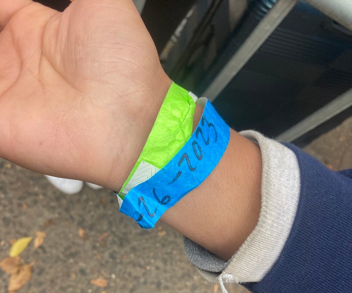 Some migrants have chosen tickets out of town, but the vast majority of those standing on line were just looking for another shelter placement. Migrants showed off wristbands with dates listed of when they arrived at the center, some as far back as over a week ago. Because they were bouncing around from place to place in the city, as well as trying to find work or locate free food, they often missed the opportunity to visit St. Brigid, and, unlike other locations serving migrants, they aren't allowed to sleep outside there overnight.