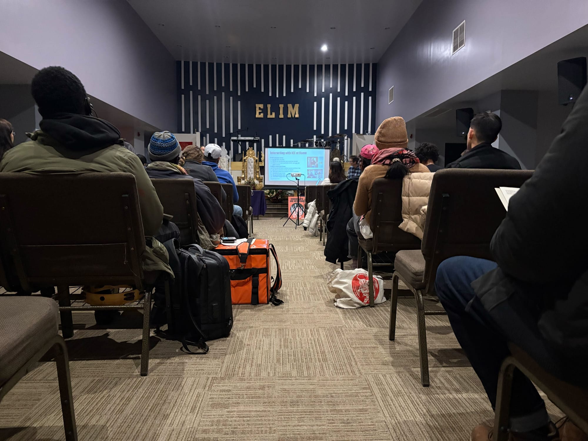The atmosphere was focused, the audience members attentive. Delivery workers stored brochures on top of bright orange refrigerator bags. Other attendees, some decked out in the merch of their respective restaurants, took out their phones to snap photos of the slides as Northia explained them. One man Facetimed in a friend, camera pointed at the screen set up in front of the pulpit as Northia explained how to identify an ICE agent: by their typical undercover cop outfit (jeans, khakis, boots, sneakers) topped with a bulletproof vest, emblazoned with something vague like "POLICE" or "HSI." The facilitator also passed around a sample "administrative warrant," an effectively powerless document signed by an ICE administrator and designed to look like the judicial warrant actually needed to enter a business or private space and extract the individual it names. "I'm showing it in English, because they will not have a translated copy," she said.