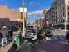 Two trucks crashed into a lightpole in Manhattan as FDNY members mill around.