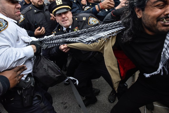 The events of last Saturday are part of the NYPD's widening crackdown against New Yorkers protesting Israel’s bloody bombing of Gaza, now in its fourth month, with the death toll over 28,000. Whereas pro-Palestine demonstrations last October and November saw relatively little confrontation with the police, almost every rally of the new year has ended with protesters picketing outside the police precinct at 1 Police Plaza, waiting for their fellow demonstrators to be released after arrest. Hell Gate counted over 45 arrests across five different actions since last month (this excludes the high-profile shutdown of Lower Manhattan on January 8). Over the past few weeks, NYPD officers have punched protesters, ripped signs out of peoples' hands, and lashed out after seemingly minor infractions, such as protesters shaking a barricade.