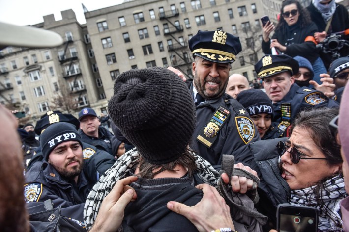 Members of the NYPD arrest pro-Palestinian protesters near Columbia University, February 2, 2024 (Stephanie Keith / Hell Gate)