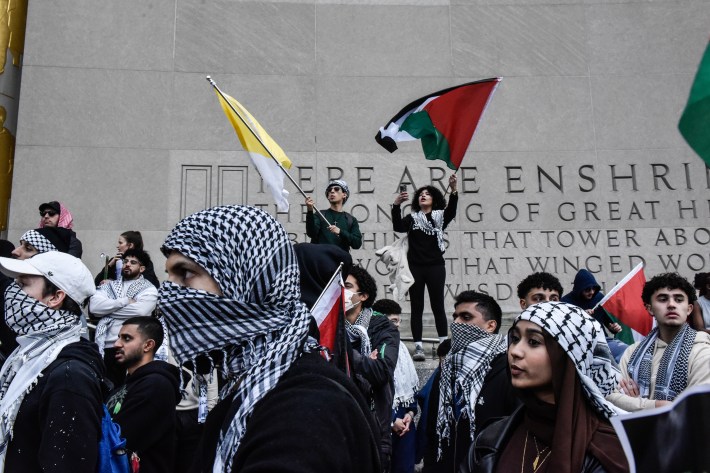 If the events of the past few weeks are any indication, the NYPD is uninterested in heeding the specifications of the agreement until it absolutely has to (per the terms, the agency should start re-training officers imminently, but oversight of its conduct during protests won't begin for months at least, and after four years the settlement lapses, with no legal scaffolding to prevent the department from backsliding). Helicopters and drones are common sights at the city’s pro-Palestine demonstrations, and protesters are being held in custody for more than the 24 hour legal limit. Officers are violently tackling protesters for standing in the street, a response that attorney Elena Cohen, who worked on the NYPD settlement, told Hell Gate is a clear violation of New Yorkers' First Amendment rights.