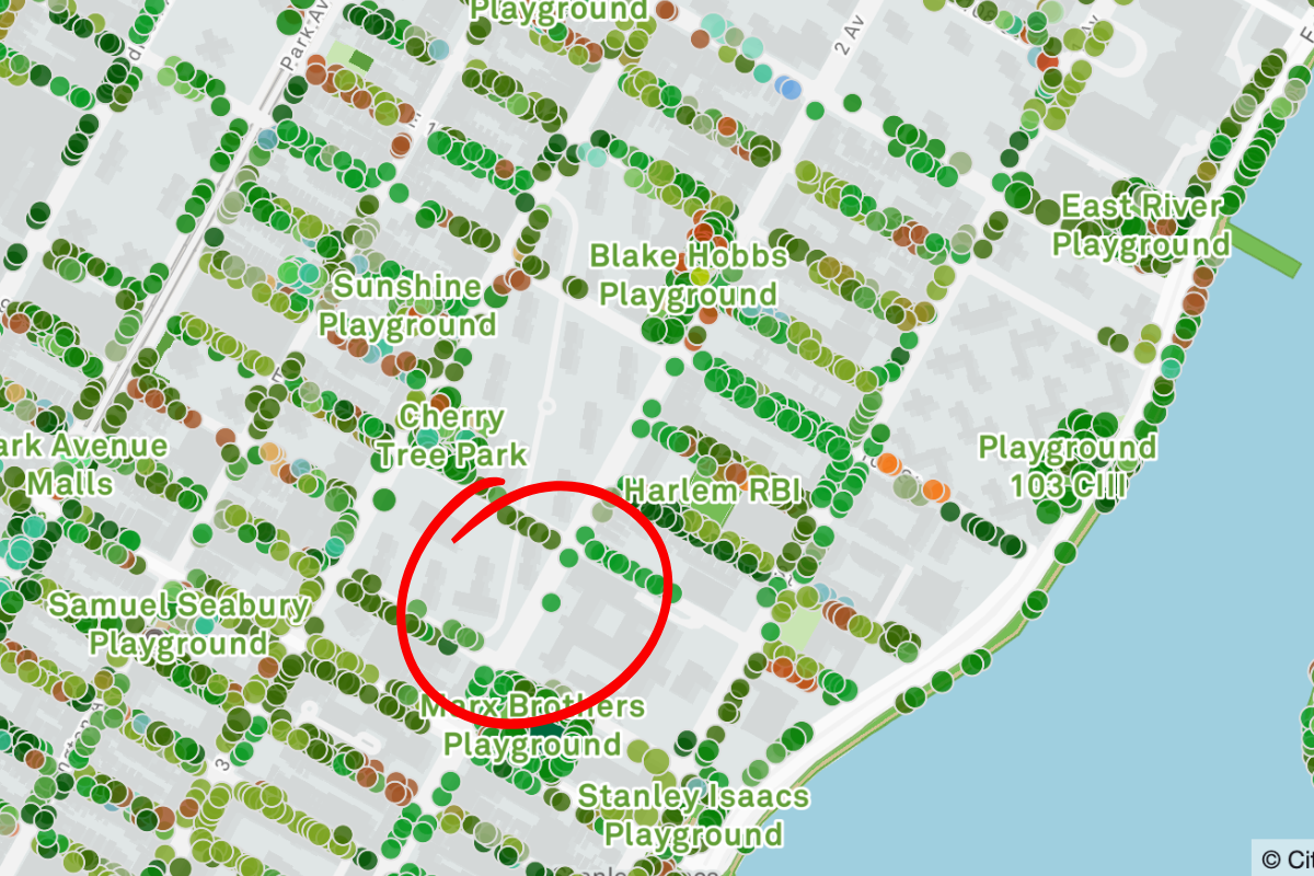 A search of canceled tree planting work orders on the City's Open Data portal found that in the period between 2018 and 2025, at least 10 scheduled plantings around precincts were voided due to reasons listed as either "precinct," "NYPD parking," or "police backin parking." The canceled work orders span across every borough. A review of the NYC Tree Map shows that there are conspicuous bald spots around many NYPD precincts.