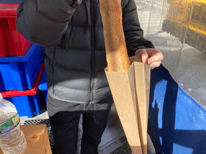 Abhay Brennan-Torell, a She Wolf wholesale driver and market worker who's also on the union's organizing committee, said they regularly wear seven layers of clothing when they head out to work in the winter, knowing that they'll be standing outside all day, hoping to sell bread even when the weather dips below freezing. "We have sides for the tents [we sell bread from] and we have heaters, but even with all that, the cold penetrates," they said. "And those days are very slow. We're just out there, not moving around very much."