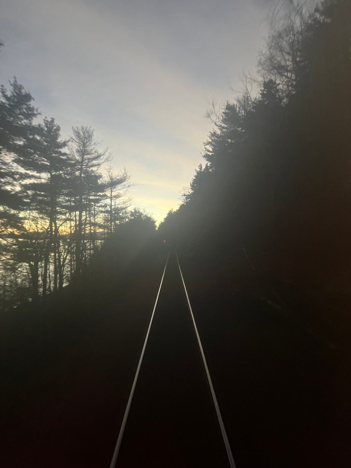 It all happens at once: the afternoon daylight becomes steelier and steelier, until Lake Champlain is gray from shore to shore. Behind us the train tracks glow, two beams of silver lining the path back to New York City. Everything else becomes one giant shadow: trees, houses, mountains.