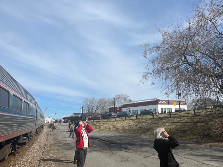 Plattsburgh is another 15 minute stop, so everyone takes a breath of fresh air. The moon is still halfway over the sun, and now what eclipse glasses are around are being passed around liberally.