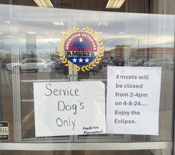 AMVets Thrift Store says it’s closing for the eclipse, but when I asked a cashier, she said the people working the afternoon and evening shift will have to stay and work on "special projects." She’s getting to leave at 1 p.m., and she’s "praying that someone mops" in her absence.