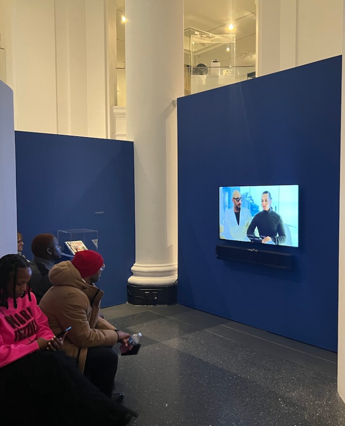 The curators, this time, relegated the personal effects and commissioned self portraits, most notably colossal Kehinde Wileys, to the margins of the show. Against the maximal florals in Dean's portrait (his second by Wiley), you can just make out the faint Louis Vuitton checking on Dean's Virgil Abloh-designed Nike Air Force 1s—market value $11,000. The paintings serve as a glorified Instagram wall—there's nothing between them, they beckon visitors to pose in the gap. But thankfully these enshrinements are limited to this very entrance to the exhibit, and a small nook in the middle. In that nook, you can sit on a sleek couch and watch a video interview with the Deans, along with an issue of Architectural Digest they're on the cover of, which is hilariously surrounded by a glass case.