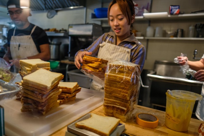 Prepping that sweet, sweet shokupan. (Scott Lynch / Hell Gate)