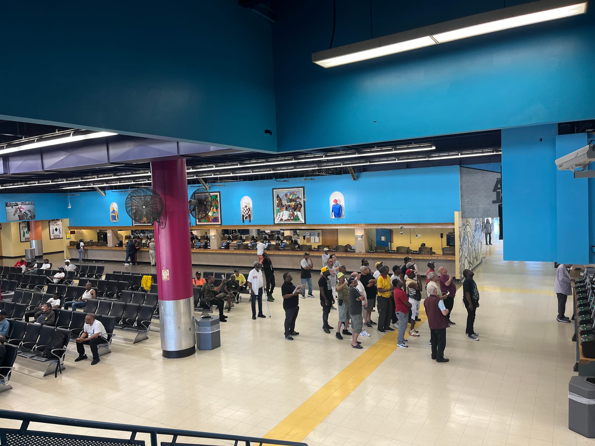 Inside the building, racegoers sheltered from the heat and watched the races unfold on the television screens across from the betting stations. Male leisure wear was on stunning display: cargo shorts with white socks and New Balance sneakers, khakis and penny loafers with smart polos, heavy gold rings with various insignia and jewels, tropical button-ups, and cabbie hats of every make and model.