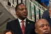 Timothy Pearson stands behind Mayor Eric Adams at City Hall on July 31, 2023 (Shutterstock)